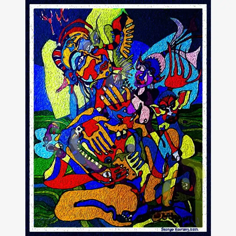 Explore emotion and form with this neo-figurative artwork. Featuring human figures and abstract elements intertwined in an expressive composition, this painting invites reflection and sparks the imagination. Ideal for contemporary art lovers seeking pieces with emotional depth and bold visual language.