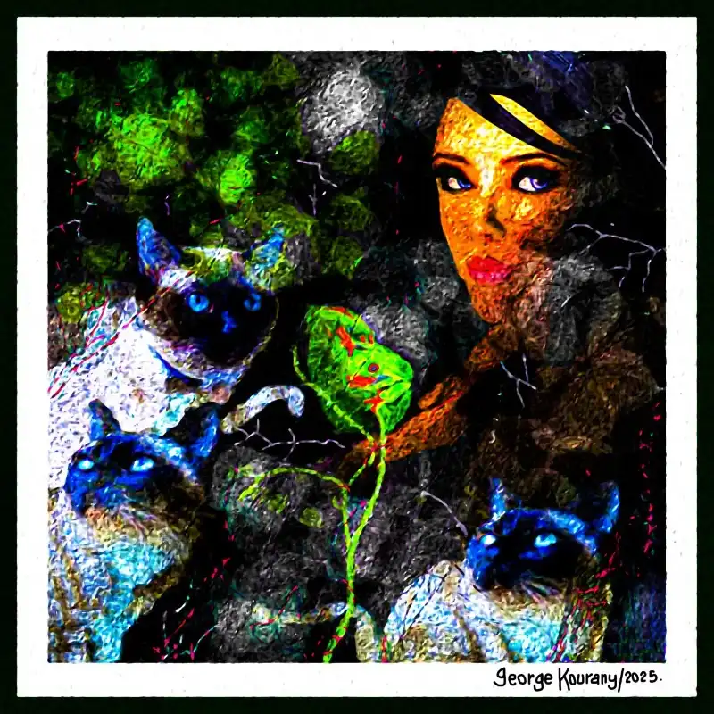 Esta obra captura la delicada conexión entre mujeres y gatos, fusionando la gracia femenina con la independencia felina. Con trazos fluidos y colores suaves, transmite una sensación de serenidad y misterio. Perfecta para aquellos que aprecian el arte que celebra la libertad, la elegancia y la belleza en su forma más pura.